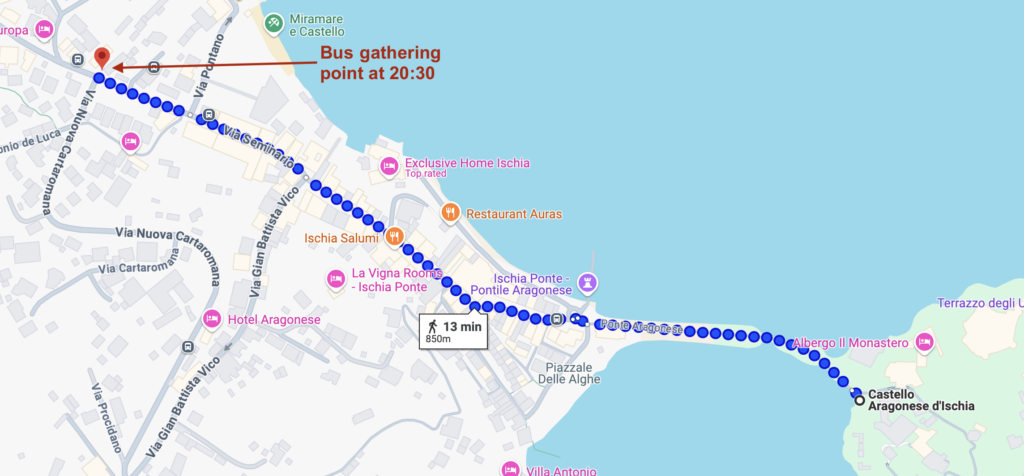 Gathering point at 20:30 with the bus to go to “Il Giardino”: https://maps.app.goo.gl/VUdcNgj1TptrNKJ7A